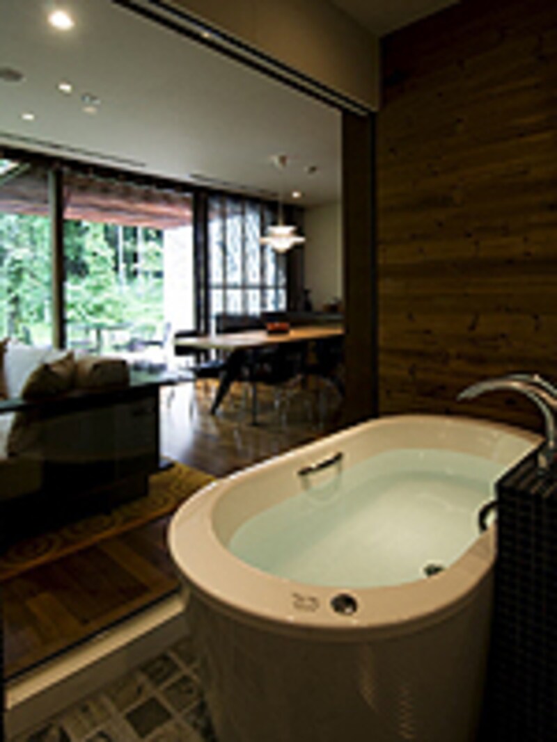 ユニークなのは部屋のレイアウト。ほぼ部屋の中央にバスルームを設けている。このお風呂は源泉から直接引いた温泉が楽しめる。高質なリネン(タオル類)やアメニティグッズ、そして磨きぬかれたメンテナンスの素晴らしさ。床暖房というのも寒さが売りのリゾートではうれしい配慮。