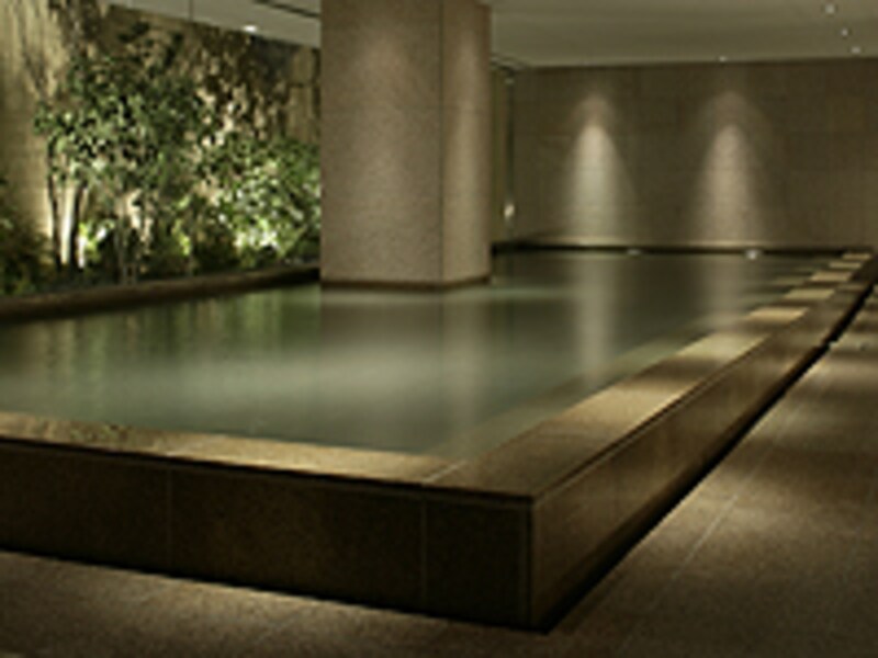 | 写真上:シックな色合いのスパウェイティングルーム/写真下:施設内の温泉 |