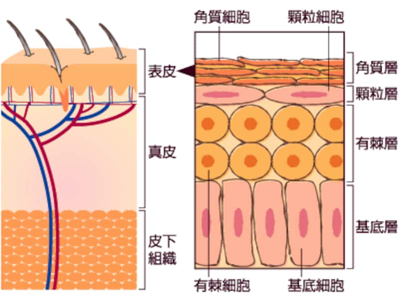 | 左:頭皮の構造……表皮、真皮、皮下組織の3層で構成 右:表皮の構造……角質層、顆粒層、有棘層、基底層で構成 |