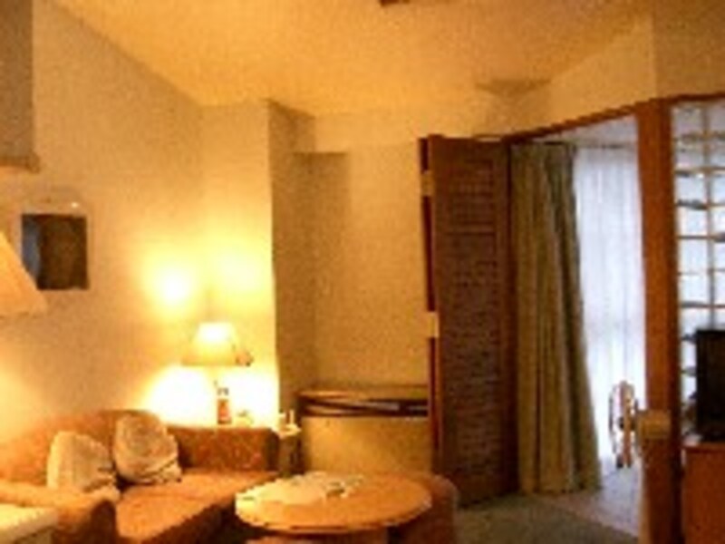 部屋の中で私が気に入ったのは、よく南の島のリゾートホテルにあるような、バスルーム。ベットルームとは木窓で続いており、開放的。湯船も大きく寛げます。