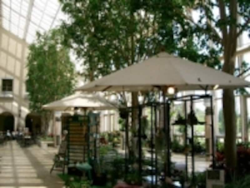 お洒落な概観のメインの建物はオアシス館。おみやげコーナー、団体食事施設、レストラン、カフェなどが併設され、緑いっぱいの吹き抜けのアトリウムが気持ちいいです。