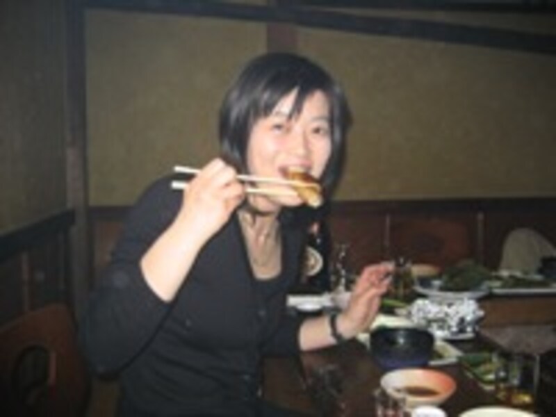 | 地鶏を頬張っています!白っぽく見えるのは炭火の煙でもやがかかっているんです。 |