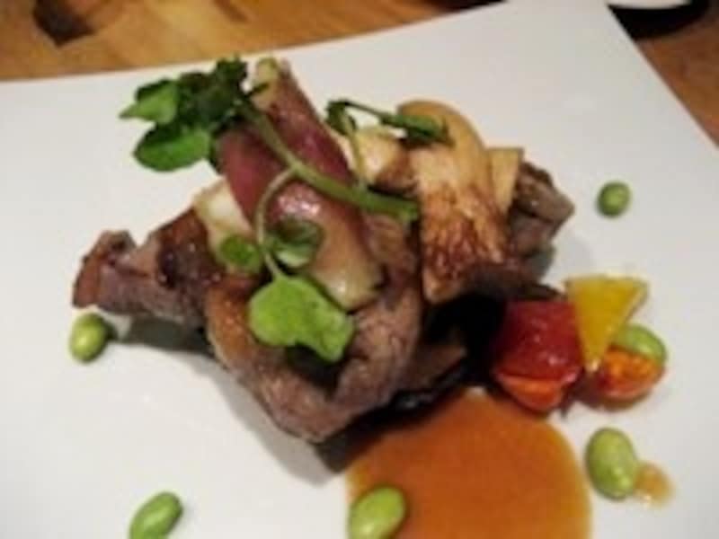 自分で好きな物をいれたお皿にニコニコ顔の息子。そうこうしているうちにメインが運ばれてきました。厚切りのナスのグリルの上に載せられたステーキは、見た目に美しく、そしてお味も、お肉はやわらかくとってもジューシーで、添えられた新鮮な地物のお野菜とのコンビネーションが抜群。ボリュームタップリでしたが、息子も何時になく食欲旺盛で、この後のデザートも含め3人ともペロリと平らげました。