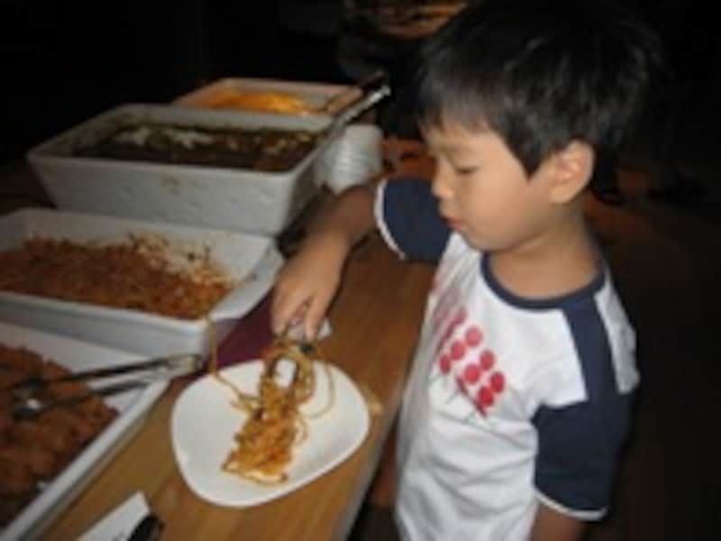 キッズコーナーは台が一段低くなっていて、子供が自分で盛り付けられるように配慮されています。息子も真剣な面持ちで挑戦! こういうちょっとしたことが子供にとっては楽しく、自信につながったりもするんですよね。またビュッフェは、席についてすぐに食べられるので子供連れには最適です。