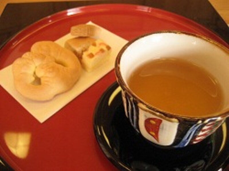 | さんぴん茶と伝統琉球菓子のセット。うるしの器にも注目 |