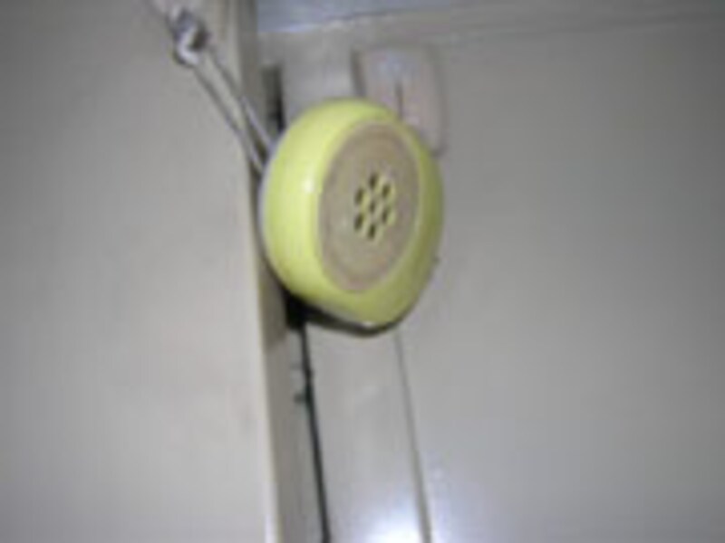 1.ドアや窓の上部二カ所にフックを取り付け、人間が通れる幅より小さく、ストッパー(絶縁板)つきの防犯ブザーのひもをセットします。