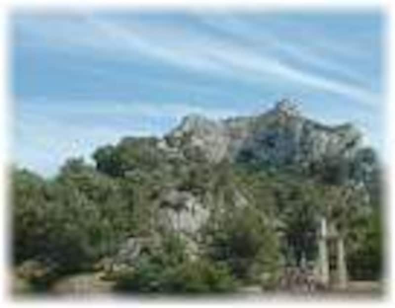 療養院の裏手にはアルピール山脈のにょきにょきと地面から湧き出たような奇岩、レ・ドゥ・トル(Les deux trous、二つのくぼみ)が見えます。道を隔てた向こうには、古代ローマの遺跡グラヌムが広がり、さきほどの道端のモニュメントはそのグラヌムのゲートの一部だったようです。実はゴッホがモチーフを求めてこのあたりをさまよった1890年頃にはまだ発掘が行われておらず、ただの野原であった為に、遺跡は作品に登場しておりませんがレ・ドゥ・トルの方はしっかりと描かれています。