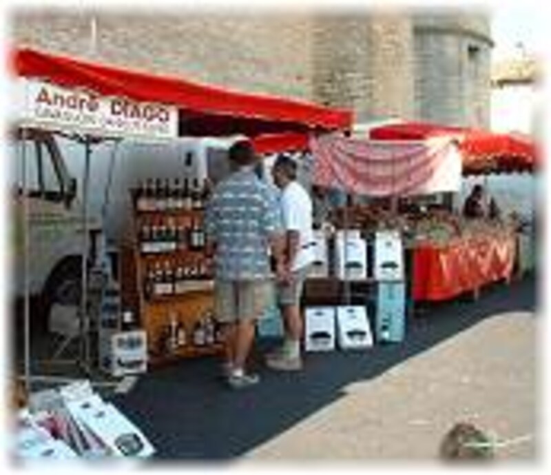 地場のワインやハーブ、ポプリ。ひときわあざやかなのはプロヴァンス染めのテーブルクロスやスカーフ、ハンカチ。もちろんおいしそうな食材。なぜか山の中なのに海の幸。大きなテーブルにぱらぱら無造作に置かれた小さな籠には黒くて丸いものが5~6個入って値段を見てびっくり。手のひらに乗りそうなこの黒いボールは、プロヴァンス名物黒トリュフ。お値段は50ユーロ、約6500円。さすがヨーロッパ版松茸、おみやげにはどうなんでしょうかね?