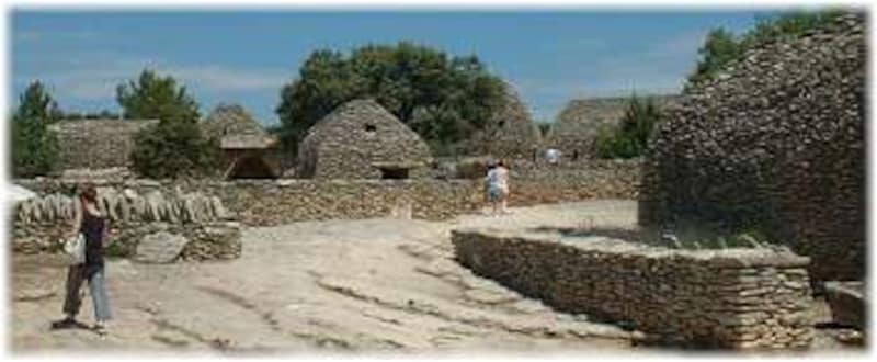 高さ1mあまりの塀が道路わきに見えてきます。この塀がすでにボリー村の一角、車を松林の中の駐車場に停め案内板に従って石塀にはさまれた狭い道を6、700メートルも進むと塀の中にベージュ色の石の山がモコモコと連なっているところが見えてきます。