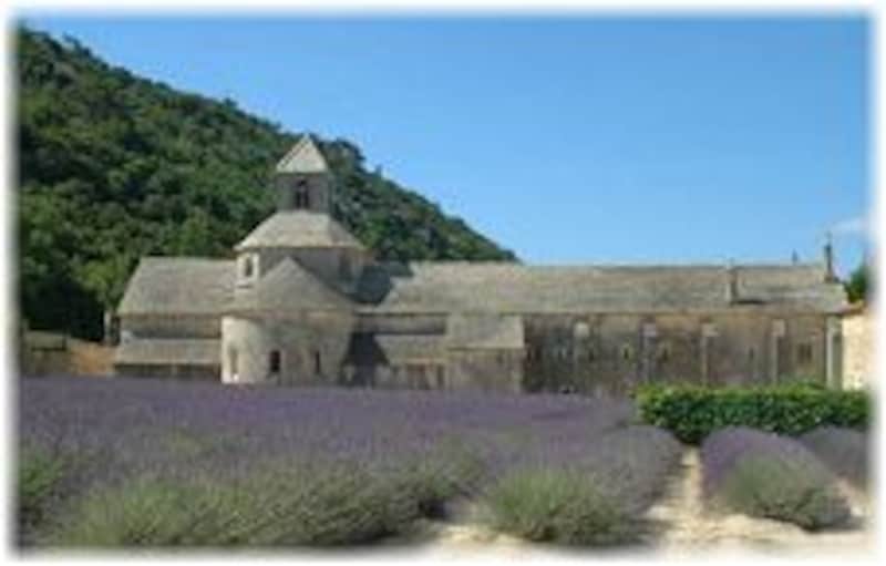 すり鉢のような谷底にある修道院のまわりの平地と言う平地はぜんぶラベンダー畑だね。もっともこの谷じゃぶどうはむりかもしれない。「おや、この修道院は聖堂の正面が東向きじゃないね!これはめずらしい。ちょうど十字架の先に当たる三位一体を意味する3つの窓はふつう東向きなんだけどな。ここは北に向かって窓を設け、コリドール(回廊)が西側だ。」