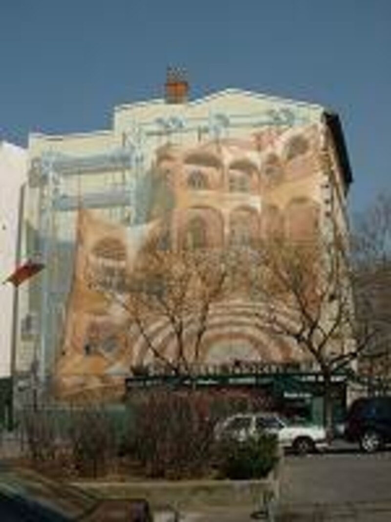 | ビルの壁面を幕でおおう工事中、かと思いきや、なんとこれ絵なんです |