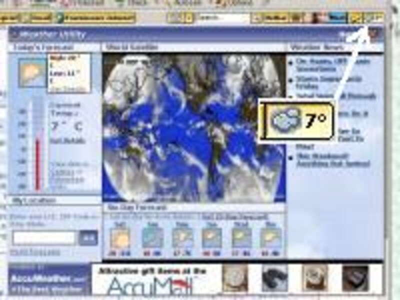 | HotBarをインストールするとツールバーの右端に気温とお天気マークが現れる。これをクリックすれば詳細な天気図や1週間の予報も表示されるウィンドウが開かれる。 |