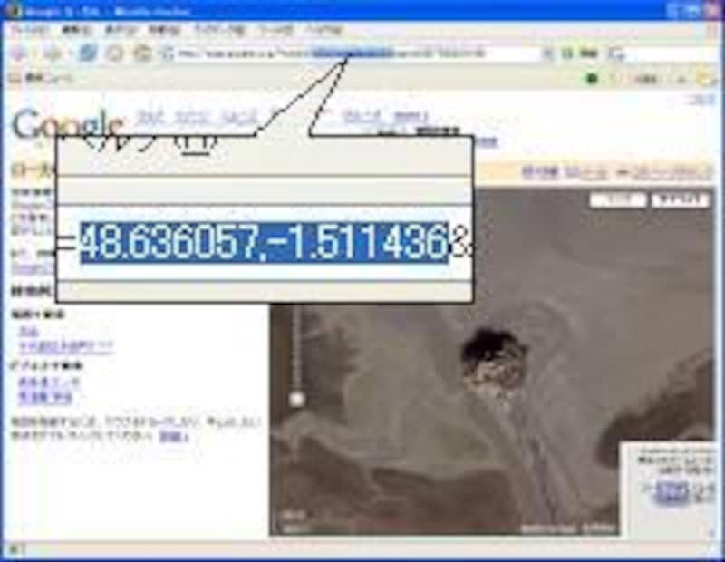 http://maps.google.co.jp/?t=k&ll=48.636057,-1.511436&spn=0.007728,0.011051こんな長ったらしいURLが表示されてますね。この数字の中にモン・サン・ミシェルの位置情報が隠されているんです。はじめの48.636057が緯度を表しています。-1.511436のほうは経度。実はロンドンのグリニッジ天文台より西にあるモン・サン・ミシェルは西経なんですね、だからマイナスがつきます。つまり、北緯48.6度、西経1.5度付近にあるってことなんです。この「48.636057,-1.511436」をコピーしてください。