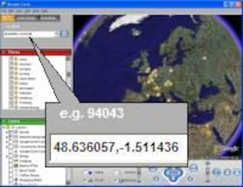 | グーグルアース、サーチ窓に例の数字をペースト、検索ボタンをクリックすれば、ホラ! |