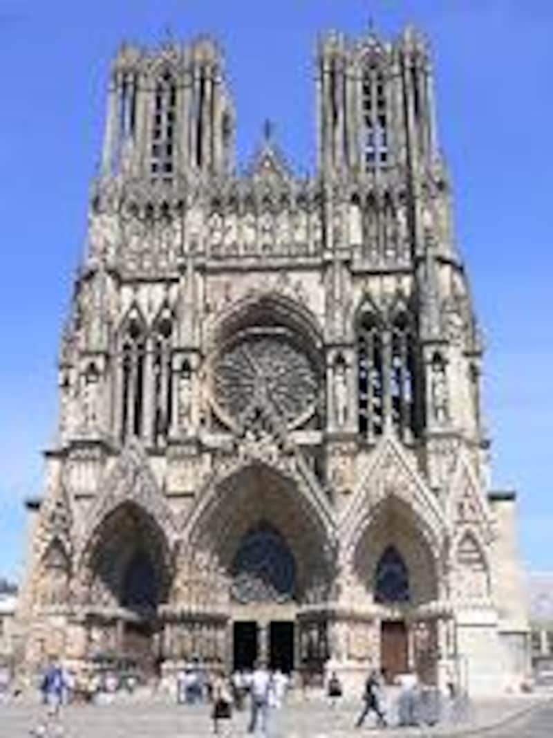 | これがランスの大聖堂正面。ドイツ軍により破壊されたことが嘘のように、800年前の姿そのままのたたずまいを見せている。しかし、よく見ると傷跡ははっきりと残っており、砕けてしまったステンドグラスは戻ることはない。この力強いフォルムは、再びあのような悲劇を繰り返さないという強い意志の象徴であるかのようだ。 |