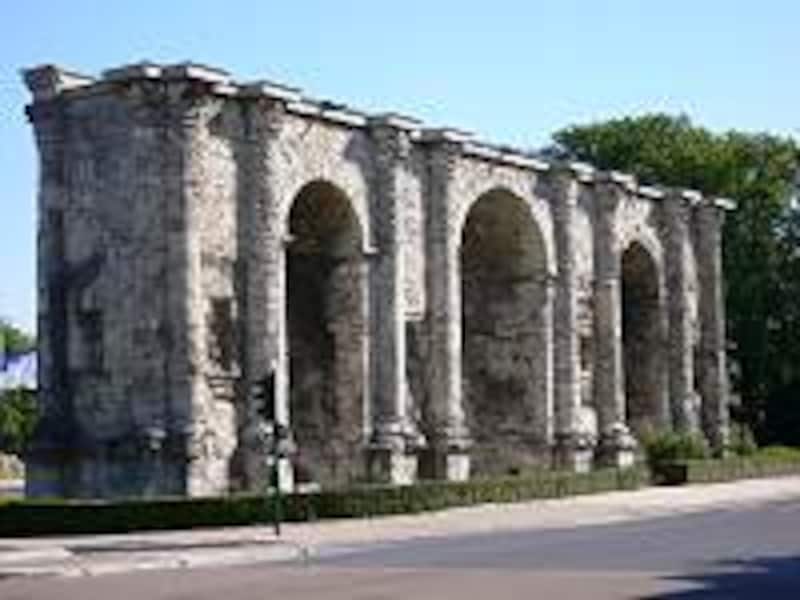 そんなプロムナードの一角、駅から出て右手(東側)すぐにある大きなロータリーの一角になにやら大きな石造りの門が見えました。石灰岩質の白っぽい肌はどう見ても凱旋門のよう、ちょっと行ってみることにしました。