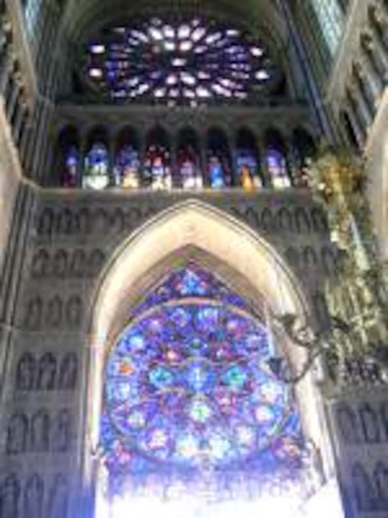 一歩中に入ると、これまで明るい光に晒され縮まっていた虹彩が、一瞬にして開いてゆくのが感じられます。聖堂内面の影が造り上げた漆黒の縁取りに、大きくとられた窓から差し込む外光が、ステンドグラスによってさまざまに色づけられ、目に飛び込んできました。