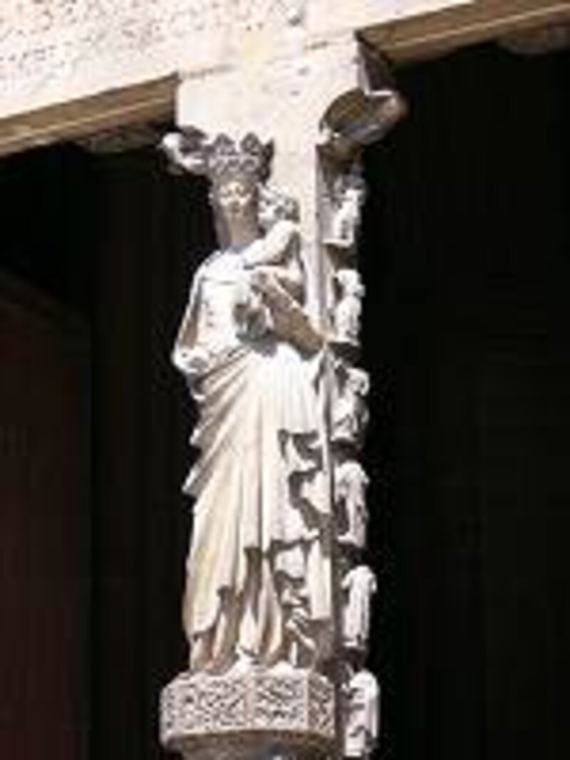 | 大聖堂の入口を支える柱には聖母子像の彫刻。ゴシック様式の、遠くから見ると模様のように見える壁面は、近づくとすべてびっしりと埋め尽くされた彫刻群であることがわかる。 |