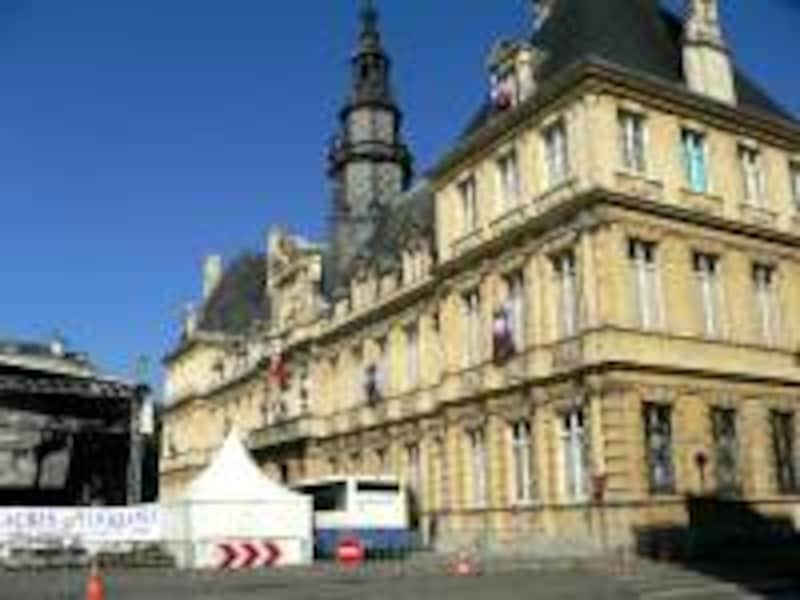 | ランス市庁舎。17世紀から始まった建造が完成したのがなんと200年後。ルネッサンス様式のルイ13世像はじめ、多くの彫刻で美しく飾られたネオクラシックな外観は見事。おや何やらイベントの準備が進んでいるようだが? |