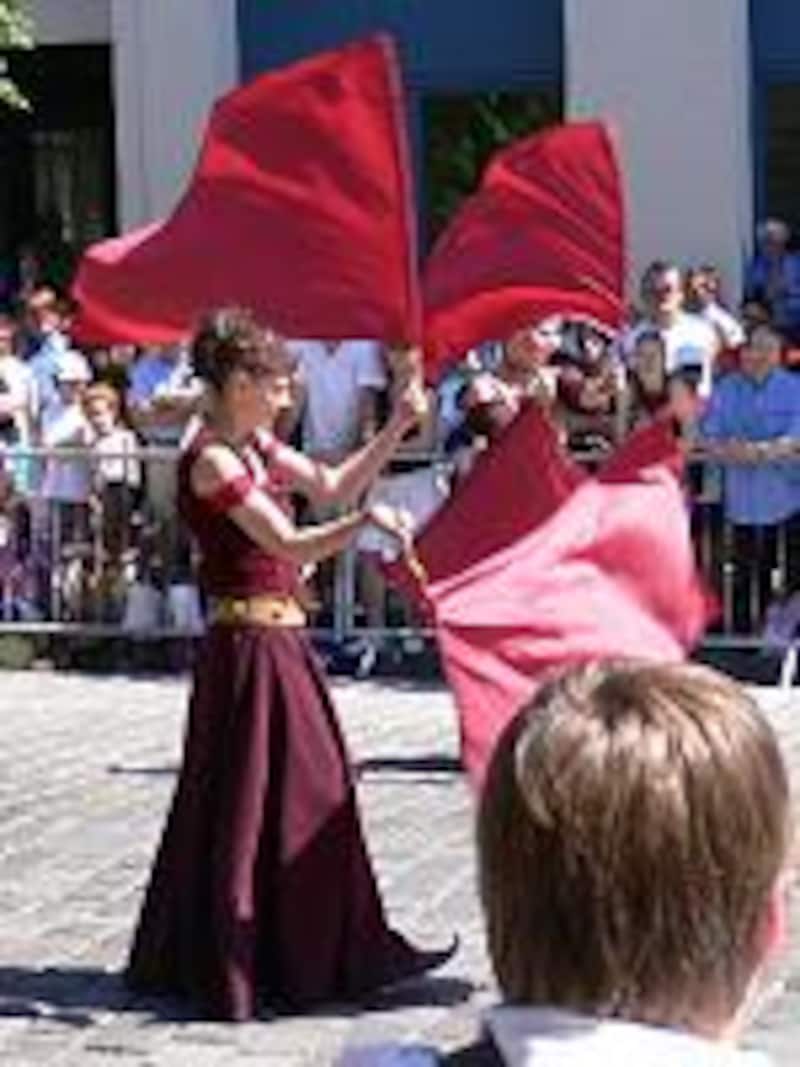 | 美女達の振り回すワインレッドの旗が、あざやかにパレードの到来を告げる。 |