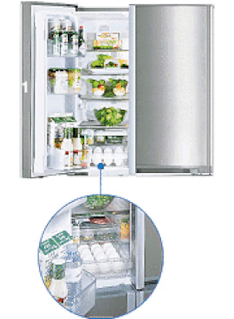 必ずついている卵ケースですが、大半がドアポケットに設定されています。しかし、ちょっと工夫を凝らしているのが以下の2メーカー。開閉の頻繁なドアポケットを避け、振動が少ない冷蔵庫本体にスペースを設定しています。こんな細かな配慮もうれしいものですね。