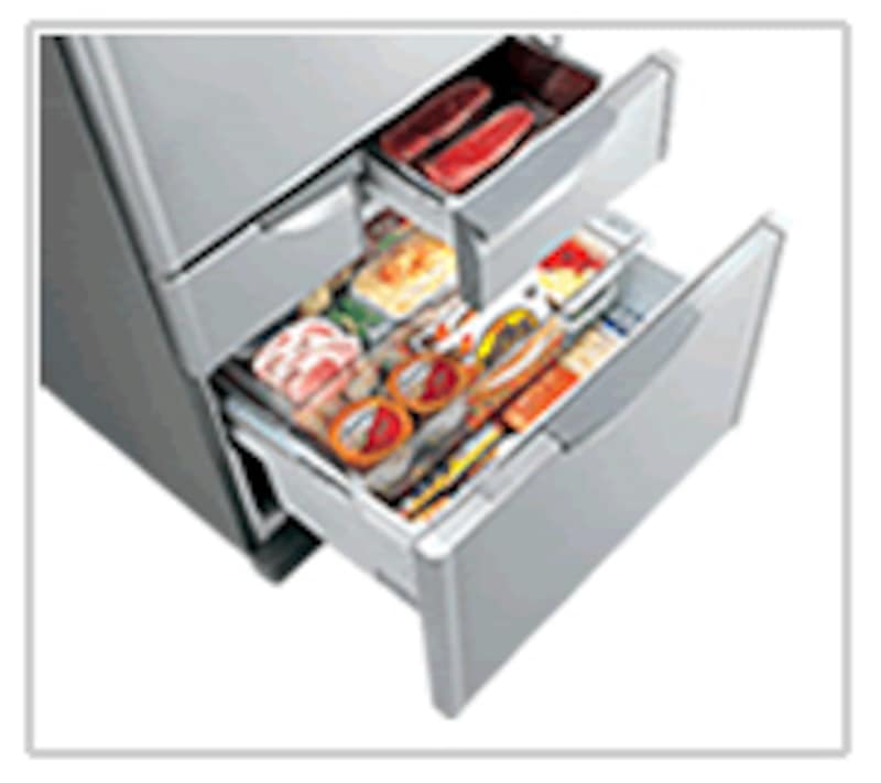 このメリットは冷気が逃げにくく効率が良い点となります。しかし、扉を開けてから引き出しを出すという2アクションになるのでやや面倒なのと、3段に分割されるため大きくガバッと入れたい人には適していないかもしれませんね。