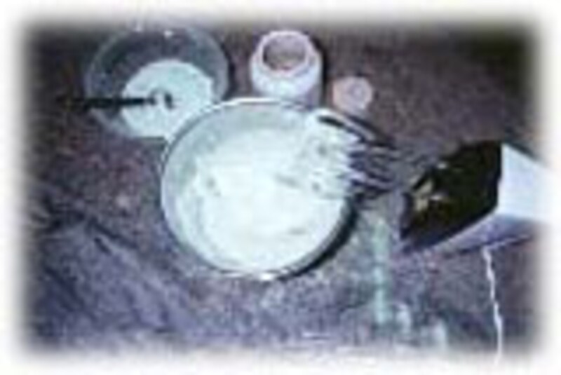 | 3. 少しづつオイルを糸状に垂らしながら加えます。少しずつとろみが出てきます。 | 4.残りのお酢大さじ1/2を加えて、よくかき混ぜます。手づくりマヨネーズのでき上がりです。 | |||