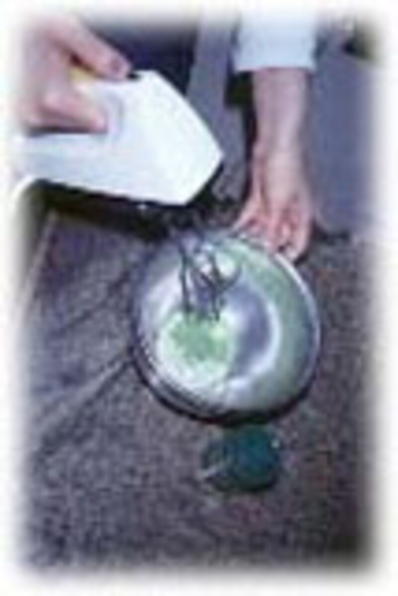 | 5. これをベースにいろいろな香料を加えてオリジナルの味を作り出してください。今回は抹茶を加えてみました。とても美しい色の調味料ができます。 | 6. 市販のマヨネーズに、庭先の山椒の新芽を刻んで加えてみましょう。 | |||