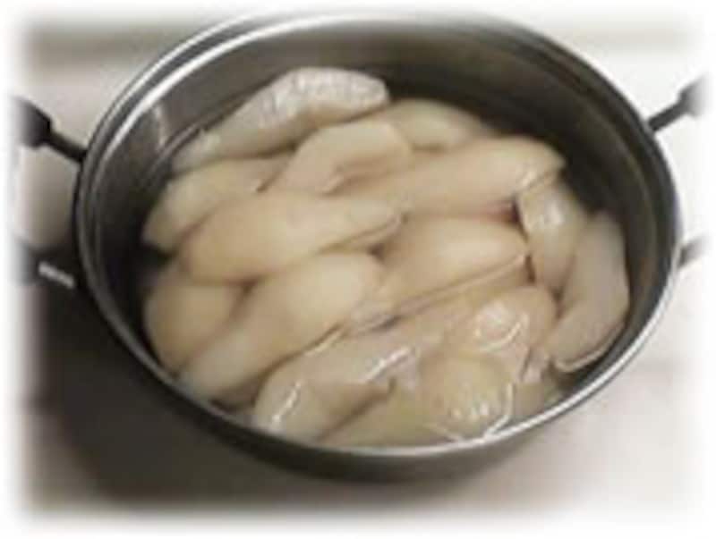 | 2:鍋に砂糖、水を入れ火にかけます。 砂糖が溶けたら、切った洋梨を入れ弱火で20分煮ます。 |