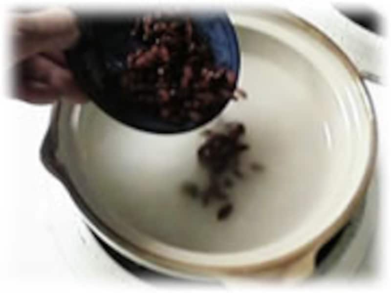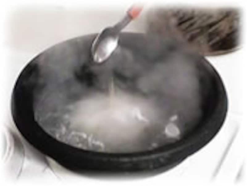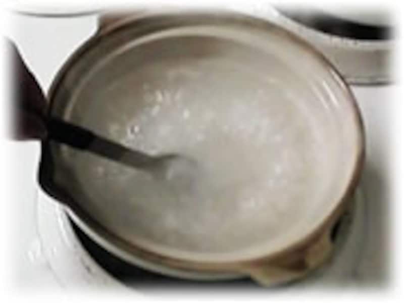 | ひとり分のおかゆなら、小さな土なべを使いましょう。 煮立ってくるまで強火で煮ながら焦げ付かないように時々ゆっくりと混ぜてやります。、その後ふたをして弱火に切り替えます。 | 約20分間弱火でコトコト煮ると、もうでき上がりです。火をとめてから、洗って水切りしておいたクコの実を加えます。 | |