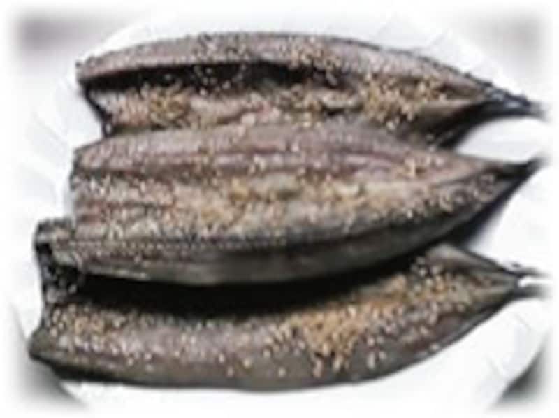 | 次に裏返して万遍なくみりん液を塗ります。 | 塗り終わったサンマはみりん液でつやつやに光っています。 | |
