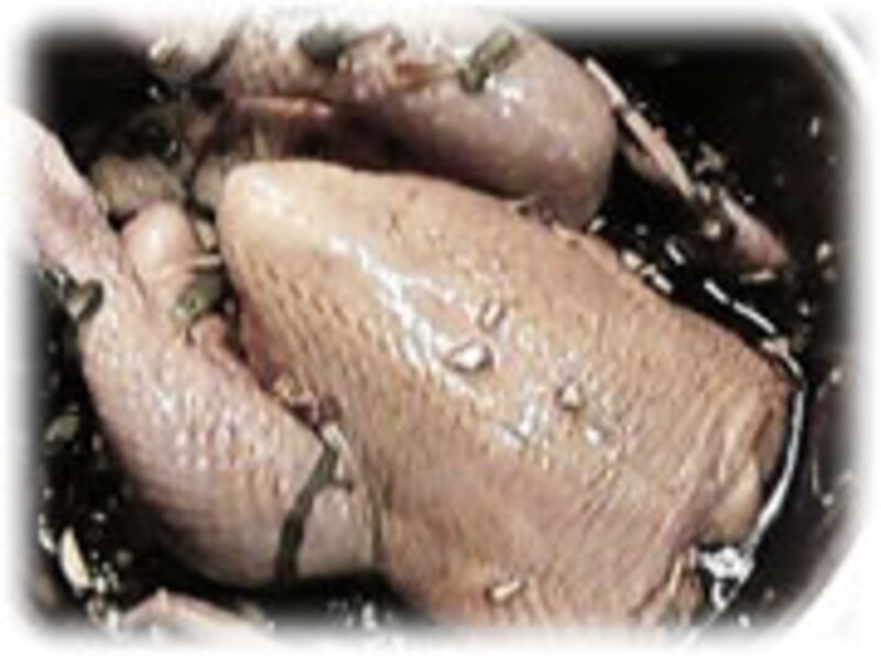 5/ さあ美味しく焼きあがりました。鳥の足には、赤いリボンと小さなベルを結びつけるとなんだかワクワクしてきませんか?漬け込んだたれは、煮詰めてソースにして召し上がってくださいね。 |