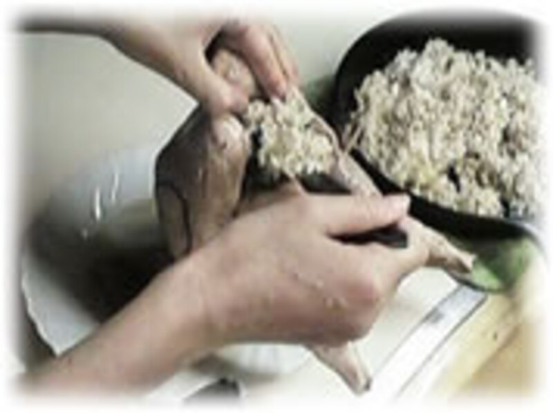 材料:四人分鳥1羽(約1.3~1.5kg)、すり込み用の塩30g、手づくりのたれ400cc(作り方はこのページの最後に書いてあります)、七味唐辛子小さじ1、ネギ1本、しょうが、ニンニク・各10gみじん切り。 鳥の中に詰める材料:米1カップ、玉ねぎ1/2、しめじ1/2パック、銀杏の実(茹でたもの)10コ、鶏がらスープ小さじ1、水1カップ、胡麻・粉チーズ少々。 |