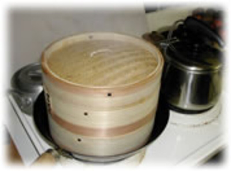 味噌かまぼこはラップに包み、上の写真のように巻きすで形を整えてから蒸し器に入れます。