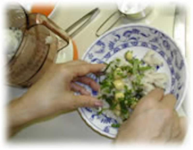 練りあがったタラの身に、銀杏の実、シソの葉を千切りしたものを混ぜ合わせます。 | |