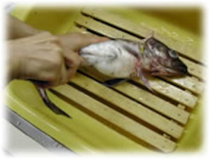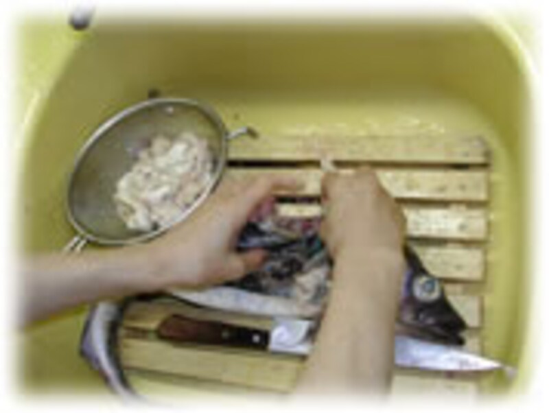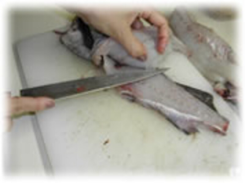 中の白子をつぶさないように注意しながら、お腹をたてに切ります。 | |