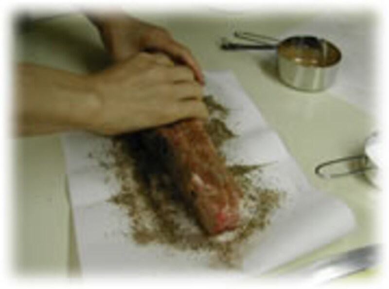 | 材料:豚バラ肉500g、塩大さじ1、黒コショウ・グローブ・ナツメグ・その他お好みの香辛料、チェリーやヒッコリー等のウッドチップ約150g、ザラメの砂糖20g。 | 1:豚バラ肉に塩と香辛料を混ぜ合わせたものを、よくすり込みます。そのあと脱水シートにくるんで一晩、冷蔵庫の中でねかせておきます。この間に余分な水分が取れ、塩やスパイスなどが適度に浸透します。 | |