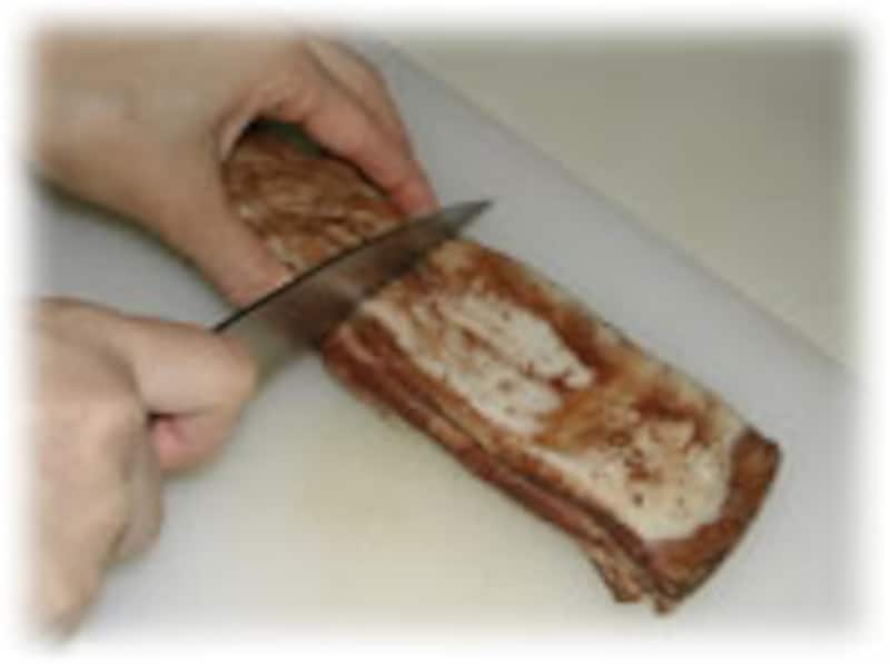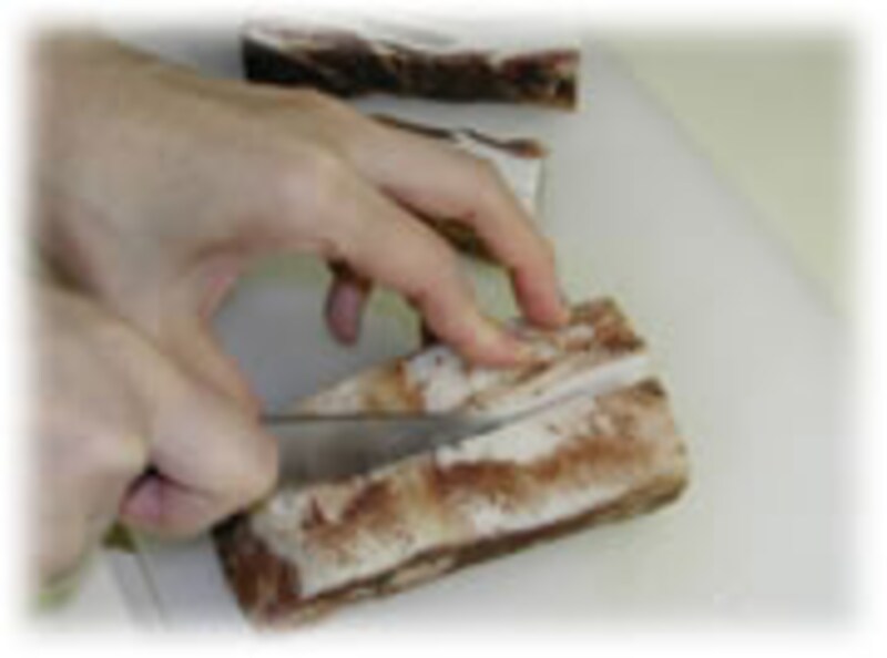 | 2:冷蔵庫から取り出し塩や香辛料を軽くはらい、バラ肉を横に2分割します。 | 3:燻煙・加熱しやすいように、縦にも2分割します。 | |