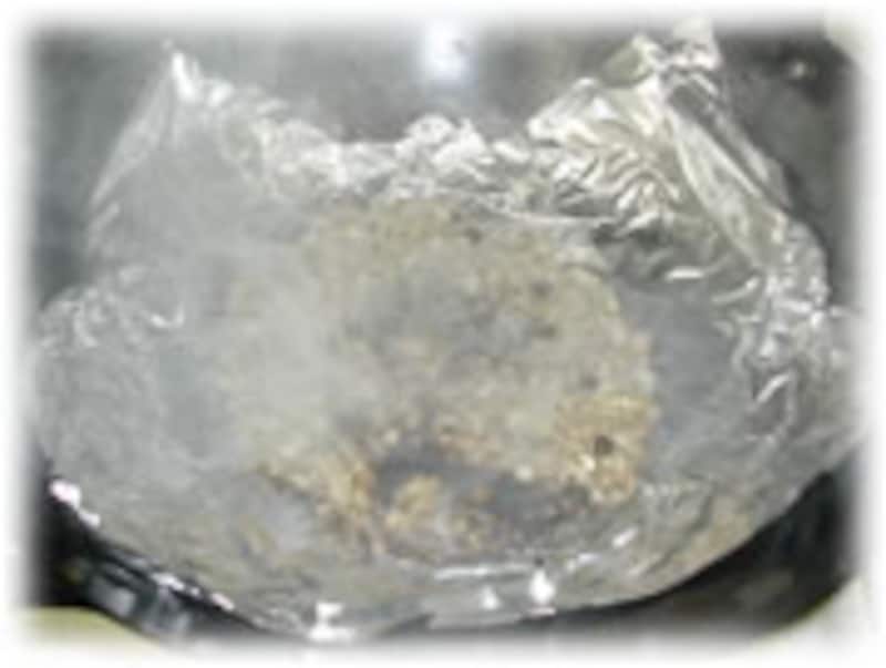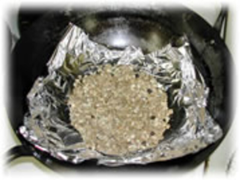 | 4:中華鍋にアルミホイルを敷き、ウッドチップとザラメの砂糖を混ぜ合わせます。 | 5:コンロの火をつけます。強火にすると、かなりの煙が出てきます。準備OKです!丸型の金網をひきます。 | |