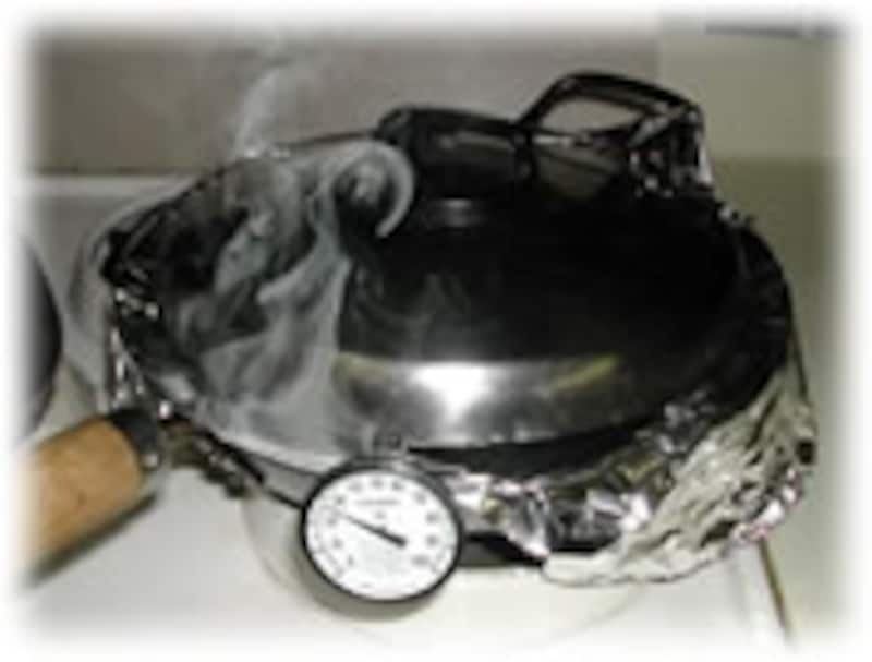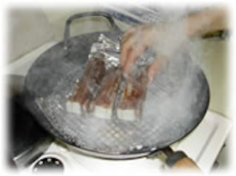 7:アルミホイルで軽く覆い、蓋をして中火で30分ほど燻煙します。煙が出続けているか気をつけます。 |