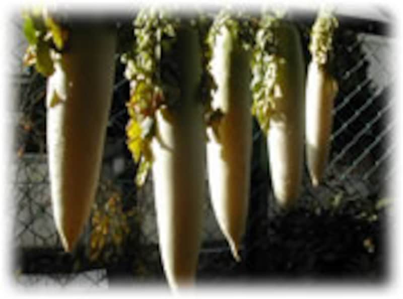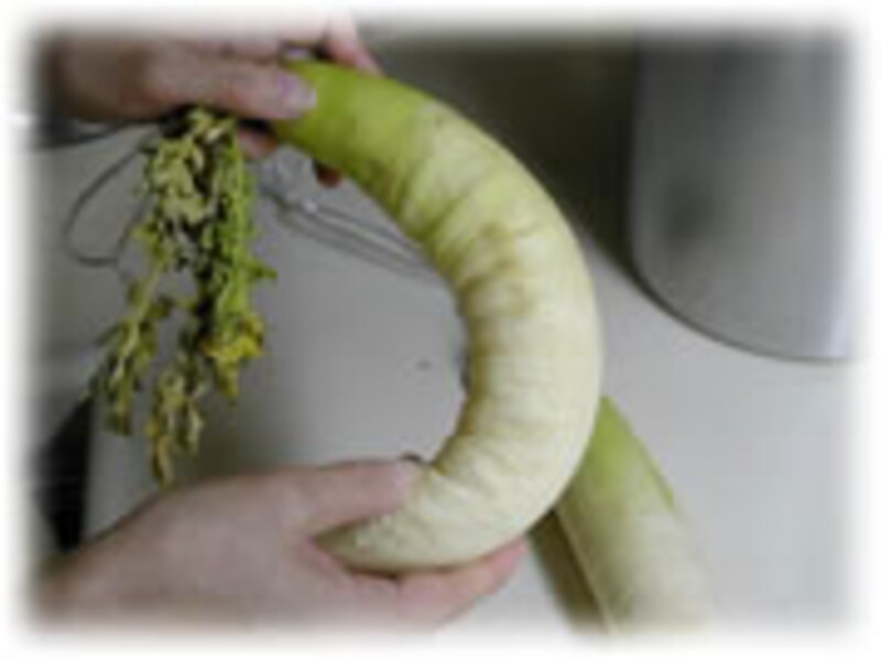 1:あまり太すぎず、細身でスマートな大根を選びます。芯まで漬かりやすくするためです。よく水で洗い、肌をさすような寒い日の続くとき、日当たりのいい場所に吊るし天日干しをします。 |