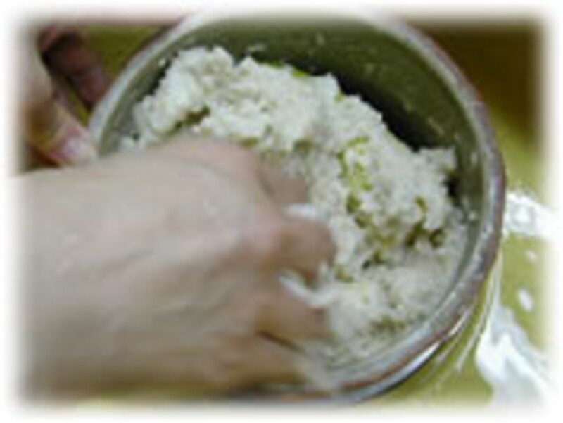 | 3:材料:天日干しの大根一本約500g、三五八の麹床600g、ぬるま湯50cc。 | 4:漬け樽に三五八の麹床とぬるま湯を、よくまぜ合せておきます。 | |