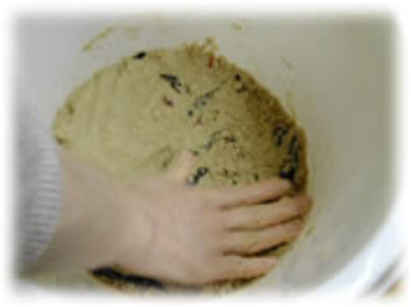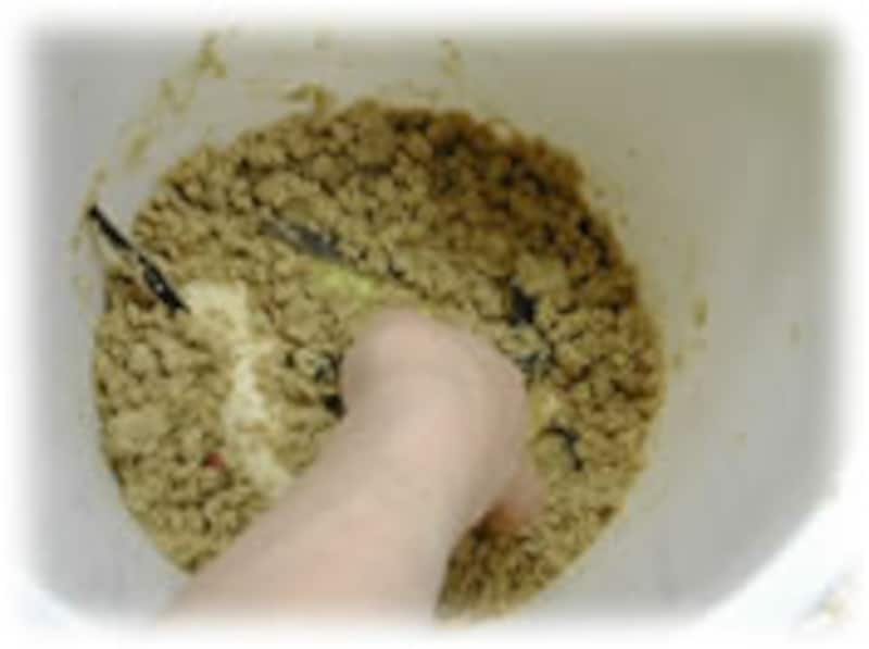 | 2:樽に混ぜ合わせた糠をいれて、2~3cmに切った昆布、鷹のツメを入れ手でよくかき混ぜます。始めは粉っぽいのですが、10日もたてば、大根の水分が上がって、しっとりとした糠床になってきます。 |