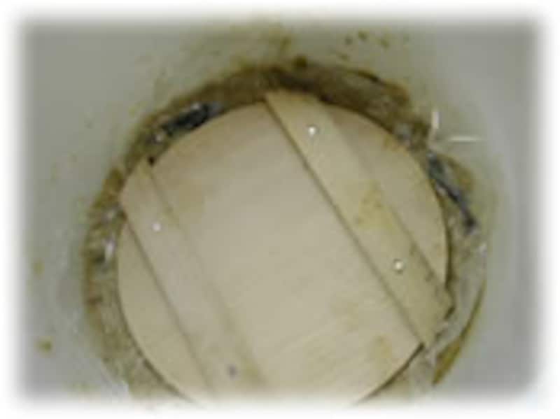 | 4:よごれが入らないように気をつけて落し蓋をします。 はじめの頃は大根の重さの2倍の重しをのせ、風通しの良い日陰で保存します。 |