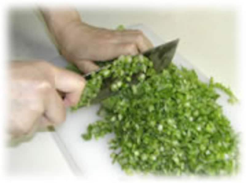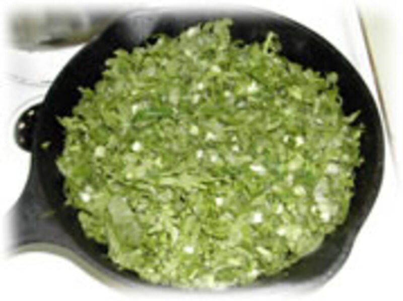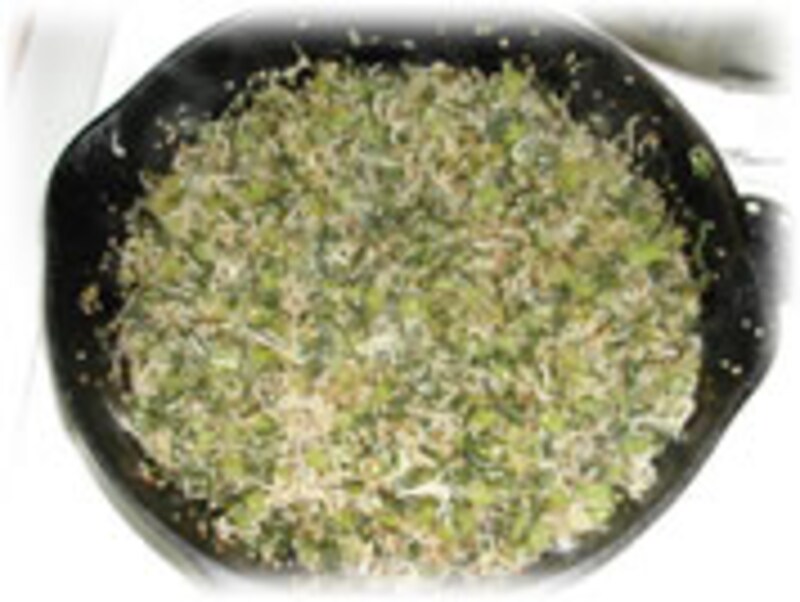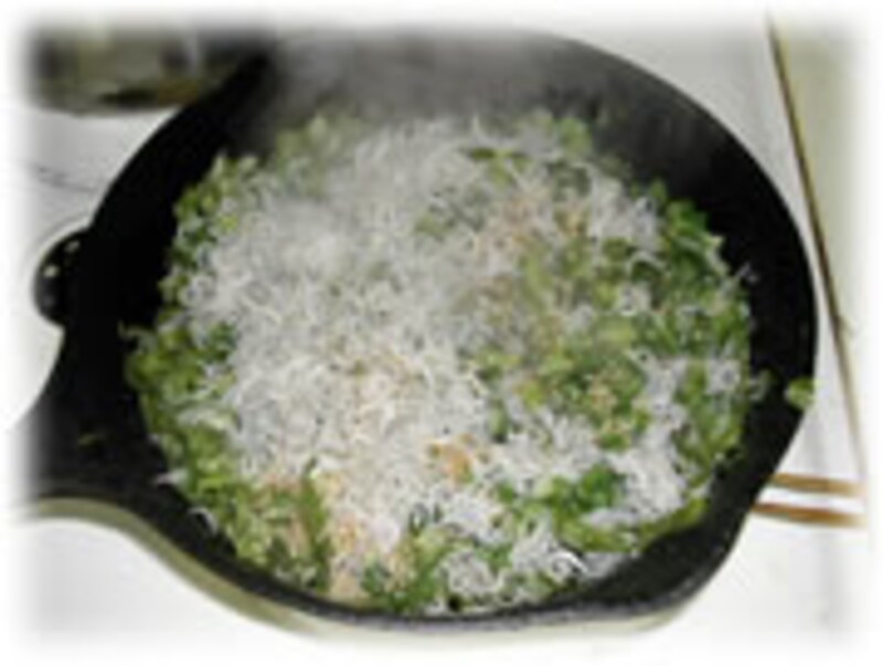 | 1:新鮮な大根菜が手に入ったら、よく水洗いをしてから細かく刻みます。 | 2:熱くしたフライパンに、たっぷりのごま油を引き、刻んだ菜を入れ、塩をほんの少し振り、水気が飛びはじめるまで良く炒ります。 | |