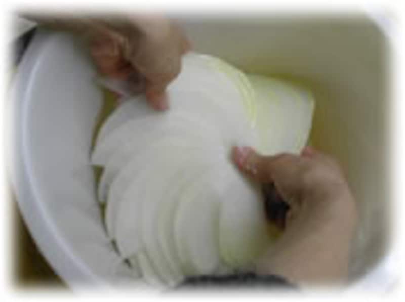 1:聖護院大根をきれいに洗い皮をむき、5mmの厚さに輪切りにします。本場の聖護院かぶは特殊なカンナでスライスするそうです。 | |