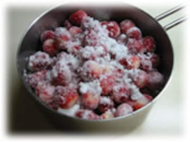 2:ホウロウ、ステンレス、耐熱ガラスなどの鍋にイチゴをいれ、その上に砂糖をまぶしてから、レモン汁を一個分絞り、3~4時間おいておきます。