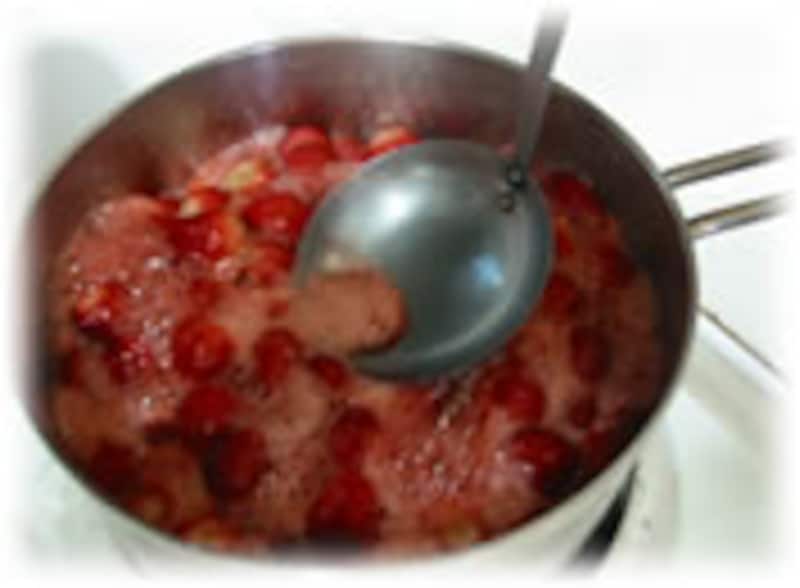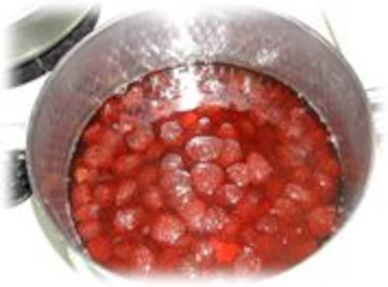 | 3:弱火で煮始めます。砂糖が溶けだしイチゴのシロップの甘い香りがキッチンに漂い始めます。焦げ付かないように、時々鍋をゆすりながら煮ます。アクが出てきたらていねいにすくい取りましょう。 |