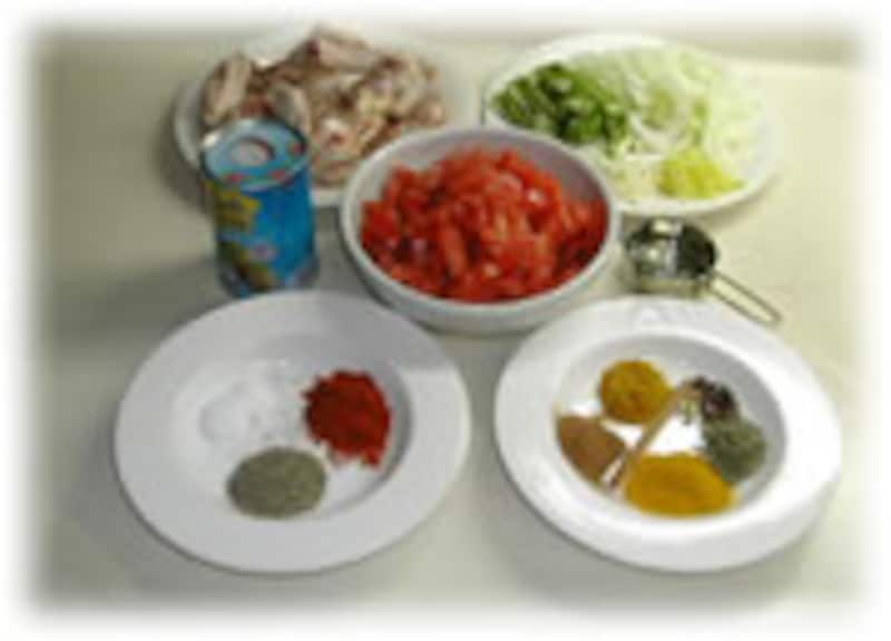 材料(6人分):鳥骨付きブツ切1kg(約12片)、玉ねぎ1個、ピーマン3個、トマト中3個、しょうが1かけ、にんにく3かけ、サラダオイル大さじ3、ココナッツミルク缶400cc一缶。 |