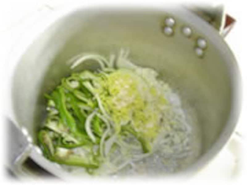 | 2:玉ねぎ、ピーマン、ニンニク、ショウガ、香辛料(1)のカレーリーフを入れ、中火で炒めます。 | 3:次に香辛料(2)を加えて、焦げ付かないようによく炒めます。 | |